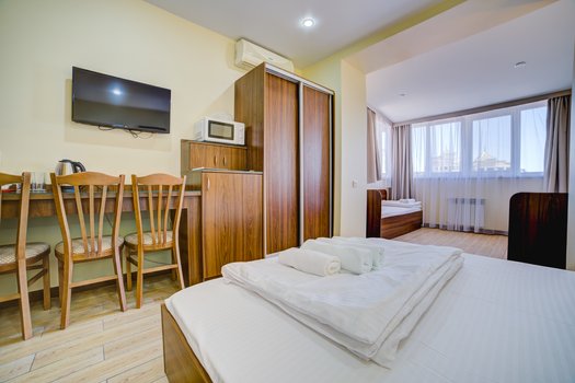 Комплекс расположен в центре Алушты, рядом с парком, городской набережной, кафе, супермаркетами и рынком. До ближайшего пляжа можно дойти за 10 минут. Гостевой дом находится в двухэтажном здании и включает 10 комнат, апартаменты с отдельным входом и коттедж. На территории предоставляется бесплатный Wi-Fi. В большинстве комнат есть балконы с видом на город, море или горы. Номера делятся на 6 категорий, что позволяет выбрать оптимальный вариант по цене и комфорту. Гостям предлагаются одноместные, двухместные, трехместные и четырехместные номера с кухней. В номерах современная мебель, ортопедические матрасы, кондиционер, холодильник, телевизор, душевая кабина, фен, гигиенические наборы и тапочки. На этаже есть оборудованная кухня. Если бы вы оказались в этом гостевом доме, утро могло бы начаться с завтрака на балконе с видом на горы или море. После прогулки по парку и набережной можно было бы зайти на рынок за свежими фруктами и овощами. Вечером вы могли бы насладиться ужином в одном из местных кафе или приготовить еду на общей кухне.