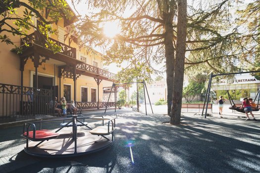 «Светлана» санаторий Сохи марказида, денгиздан ҳозирги 200 метр масофада, парк зонасида жойлашган. Фрунзе номли парк, Дендрарий, «Фестивальный» концерт зали, цирк, Ёзги ва Қишги театрлар, соҳил бўйи ва Денгиз порти билан ўралган бу санаторий турли дам олиш имкониятларини тақдим этади. Дўконлар, кафе ва бозорлар яқинлиги туфайли бу жой оилавий ва ёшлар учун жозибалидир. Санаторийнинг саккиз қаватли биноси атрофдаги дарахтлар, узоқ тоғлар ва денгиз кўринишларини кўрсатади. Яқиндан таъмирланган, замонавий уй-жой музлатгичлари, ҳаммом ва балконли қулай хоналарда 460 дан ортиқ меҳмон жойлаша олади. Санаторийда кунда уч марта «швед стол» тизимида овқатланиш ташкил этилган, кўпинча соғлиқни сақлаш дастурлари билан бирга. Меҳмонларга тиббий маслиҳатлар, массаж, физиотерапия ва лазер даво усуллари таклиф этилади. Шунингдек, «Жемчужина» шаҳар пляжидан фойдаланиш имконияти мавжуд. Санаторийда процедура хоналари, ошхона, ресторан ва кафелар, китобхона, текин автомобиль қуйиш майдони, замонавий болалар майдочиги мавжуд. Очиқ ҳавз йил бўйи ишлайди ва SPA-марказнинг бир қисмидир. Ҳаммом мажмуасидан тўғри ҳавзга чиқиш мумкин. Санаторийда концертлар, экскурсиялар, саёҳатлар каби маданий тадбирлар ўтказилади. Ёзги мавсумда кундузи болалар, кечаси эса катталар учун анимация дастурлари тайёрланган. Янги йил байрамларида ҳам турли тадбирлар ўтказилади. Санаторийдан 400 метр масофадаги «Жемчужина» пляжи алмаштириш кабинкалари, шезлонг, соябон ва душ каби барча қулайликлар билан жиҳозланган. Санаторийга яқинроқ, 200 метр масофада шаҳар пляжи жойлашган. «Светлана» санаторийга келганингизда, кунга паркда сэйр қилишдан бошлангиз, кейин пляждан баҳраманд бўлинг, маҳаллий кафелардан бирида тушлик қилинг ва кеча театр ёки концерт билан якқол қолинг.